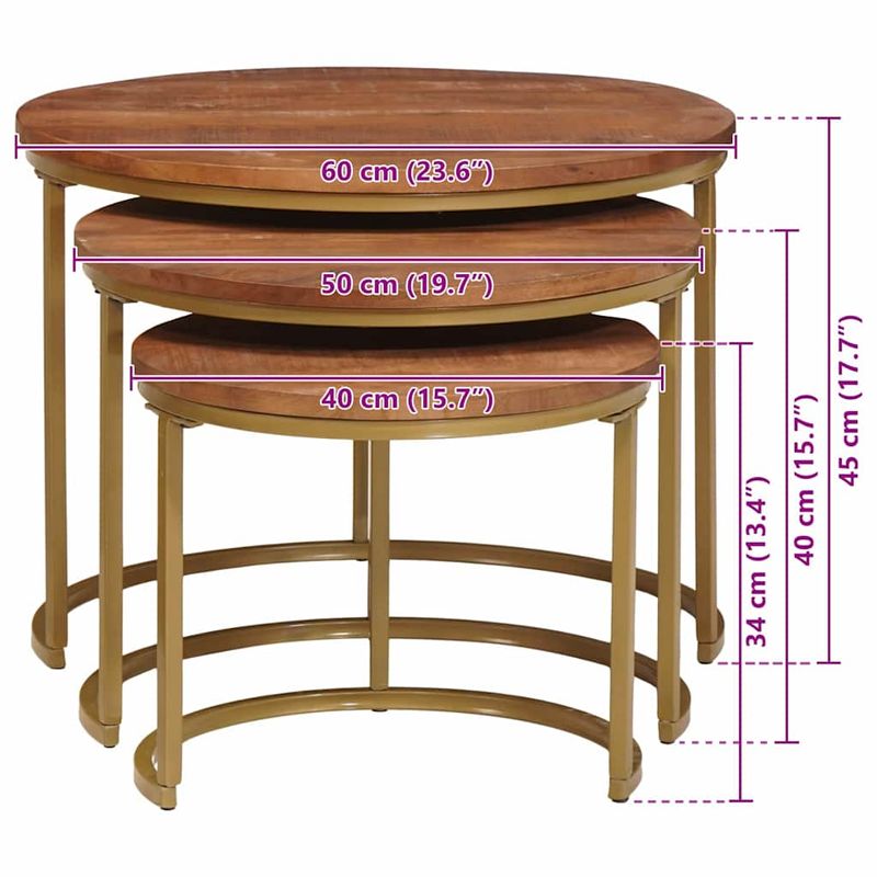 Materiale de Inalta Calitate Mesele sunt din lemn masiv de mango, cu textura bogata si fibra tare. Blaturile sunt sustinute de un cadru solid din otel vopsit, ce ofera stabilitate si rezistenta, pastrand un stil modern, industrial. Functionalitate de Nesting Mesele astea se pot incapa una sub alta, perfect pentru spatii mai mici. Masa mica se potriveste perfect sub cea mare, astfel recuperezi rapid podeaua cand nu ai nevoie de ele. Designul le face usor de mutat si aranjat in orice loc. Utilizare Versatila Ele functioneaza ca un trio, fiind foarte utile pentru diverse scopuri. Poti sa le folosesti ca suprafete pentru decor, pentru gustari in timp ce te intalnesti cu prietenii sau doar ca sa iti pui cafeaua de dimineata. Formele rotunde sunt prietenoase cu copiii, reducand riscul colturilor ascutite si oferind o atmosfera primitoare in living. Asamblare Minimala Necesara Asamblarea e simpla si nu-ti trebuie decat cateva unelte obisnuite. Instructiunile clare te ajuta sa le pui cap la cap fara stres, astfel poti integra rapid mesele astea versatile in spatiul tau. Sfaturi de Intretinere Mesele din lemn se curata usor cu o carpa uscata pentru a pastra frumusetea naturala. Evita produsele chimice dure care pot strica lemnul sau otelul. Lustruieste-le usor cand e nevoie ca sa le aduci stralucirea inapoi. Ingrijirea corecta asigura o utilizare pe termen lung si un look estetica de durata.