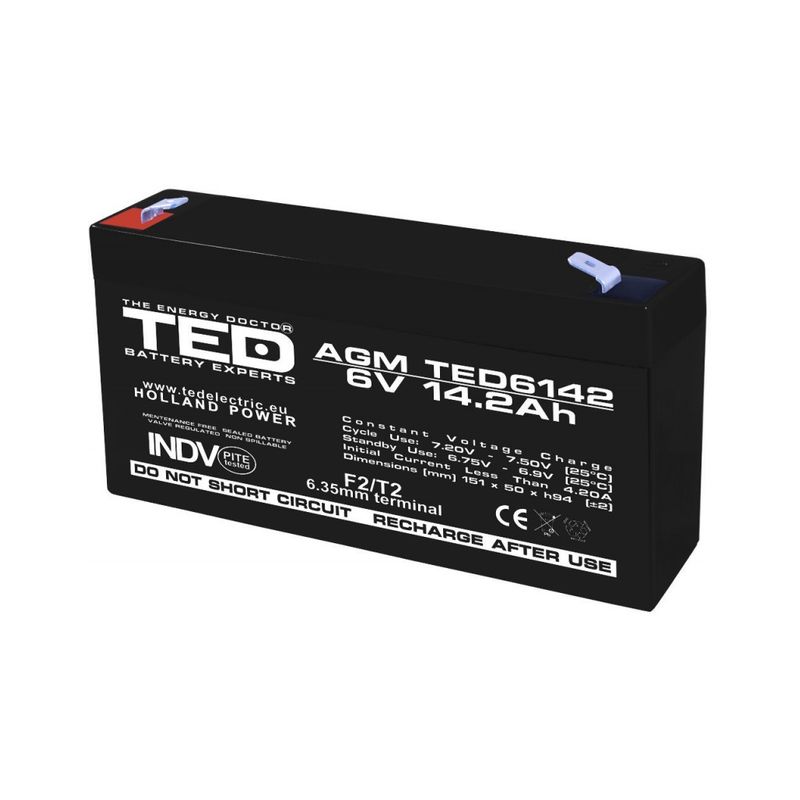 Acumulator AGM VRLA 6V 14,2A dimensiuni 151mm x 50mm x h 95mm F2 TED Battery Expert Holland TED003034 (10) Acumulator AGM VRLA 6V 14,2A dimensiuni 151mm x 50mm x h 95mm F2 TED Battery Expert Holland TED003034 (10)