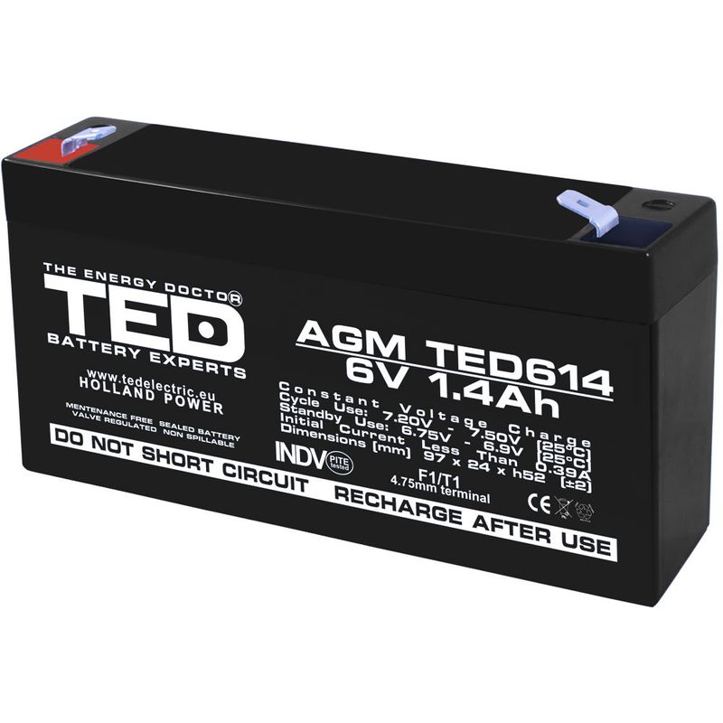 Acumulator AGM VRLA 6 V 1,4 A dimensiuni 97 mm x 25 m m x h 54 mm F1 TED002839