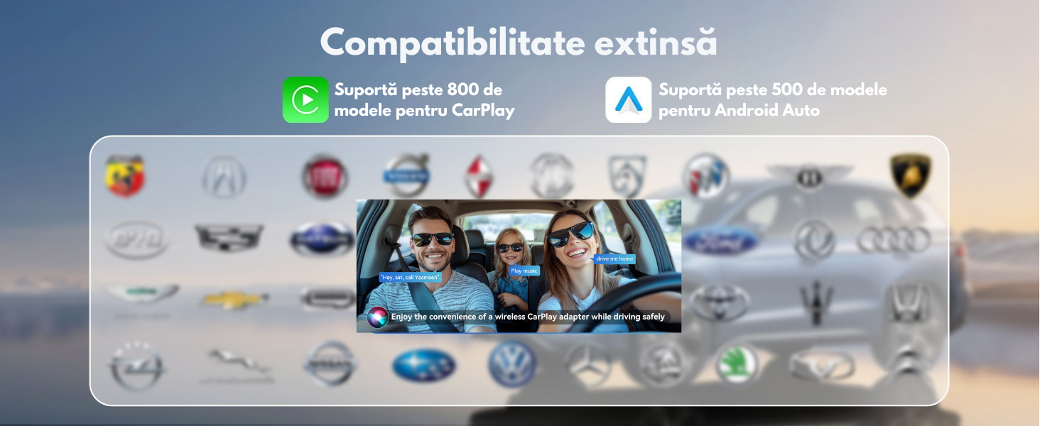 Suporta peste 800 de modele auto cu Apple CarPlay si 500 de modele cu Android Auto.