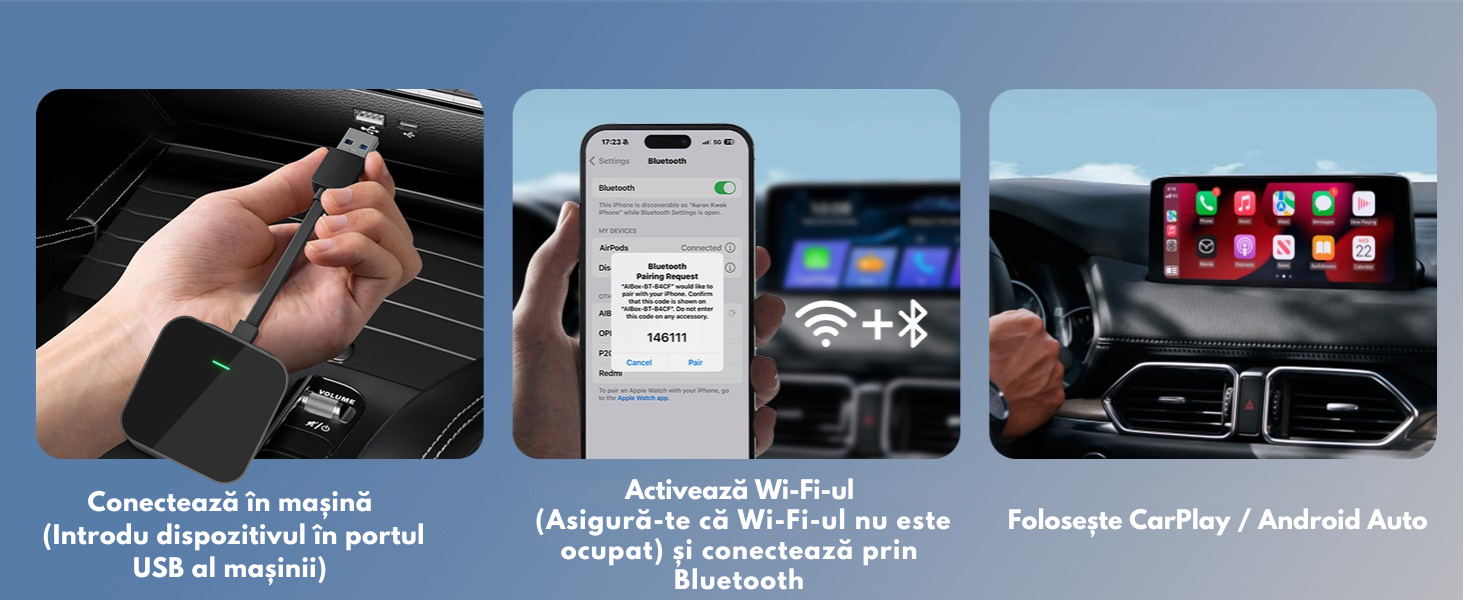 Conecteaza adaptorul in portul USB destinat CarPlay si esti gata de drum.