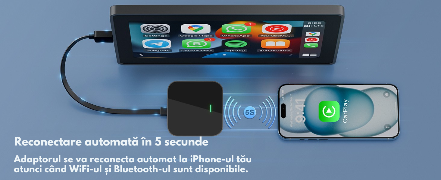 Adaptor Wireless CarPlay & Android Auto 2-in-1 Dasbo® Model 2026 – Compatibilitate universala prin USB Android & IOS Auto, conectare automata, fara fire, plug &play, Oglindire Waze, Harti in Navigatie, Conectare la Microfonul Masinii, Sincronizare Rapida.