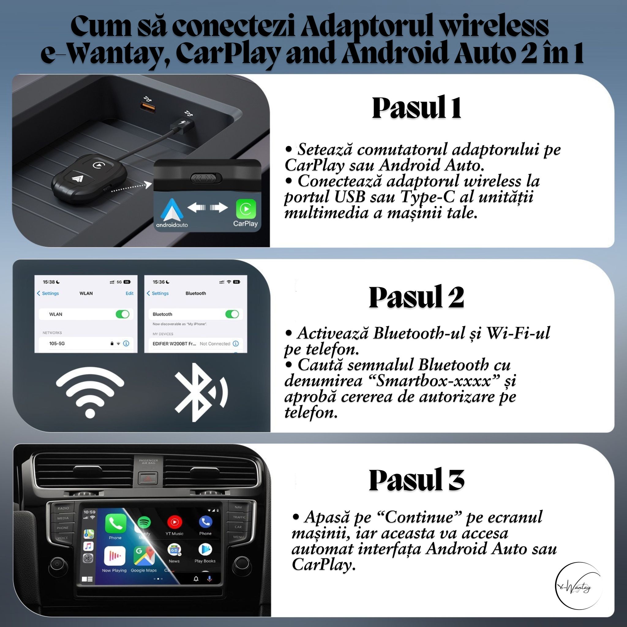 Transforma experienta de condus cu Adaptorul wireless e-Wantay, CarPlay si Android Auto 2 in 1!