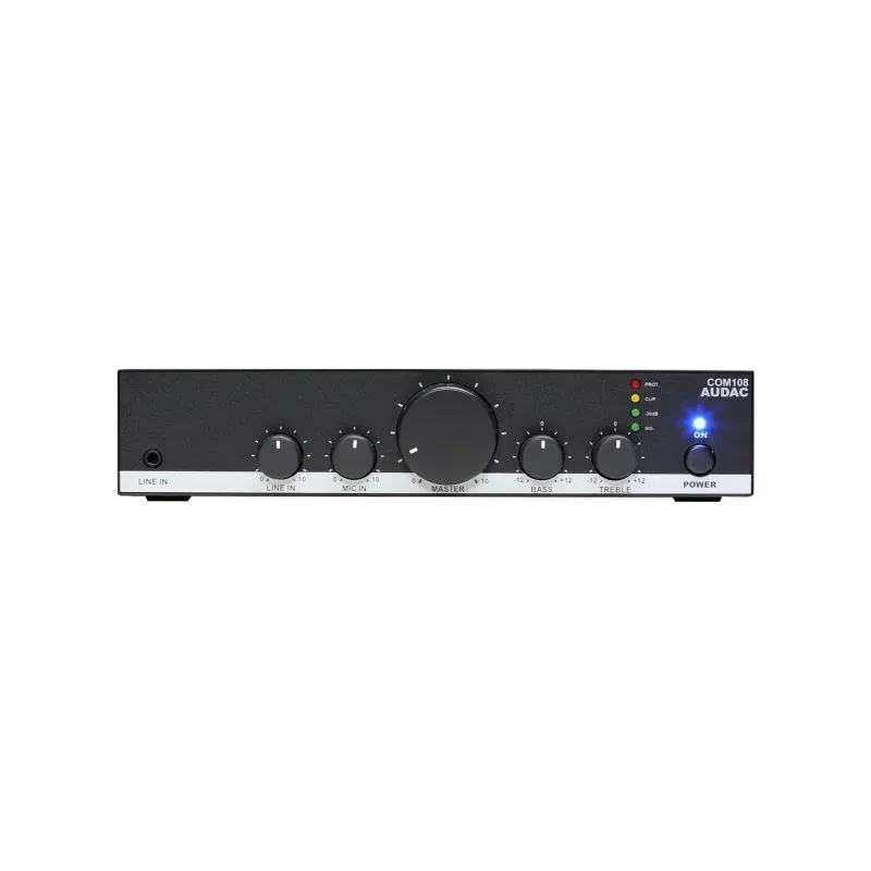 Amplificator 100V Audac COM108, un amplificator compact si versatil, care ofera solutii pentru Sisteme Audio de dimensiuni mici si medii In instalatii comerciale. Aplicatiile tipice sunt Sistemele de muzica de fundal din magazinele de vanzare cu amanuntul, baruri, restaurante si cladiri de birouri.