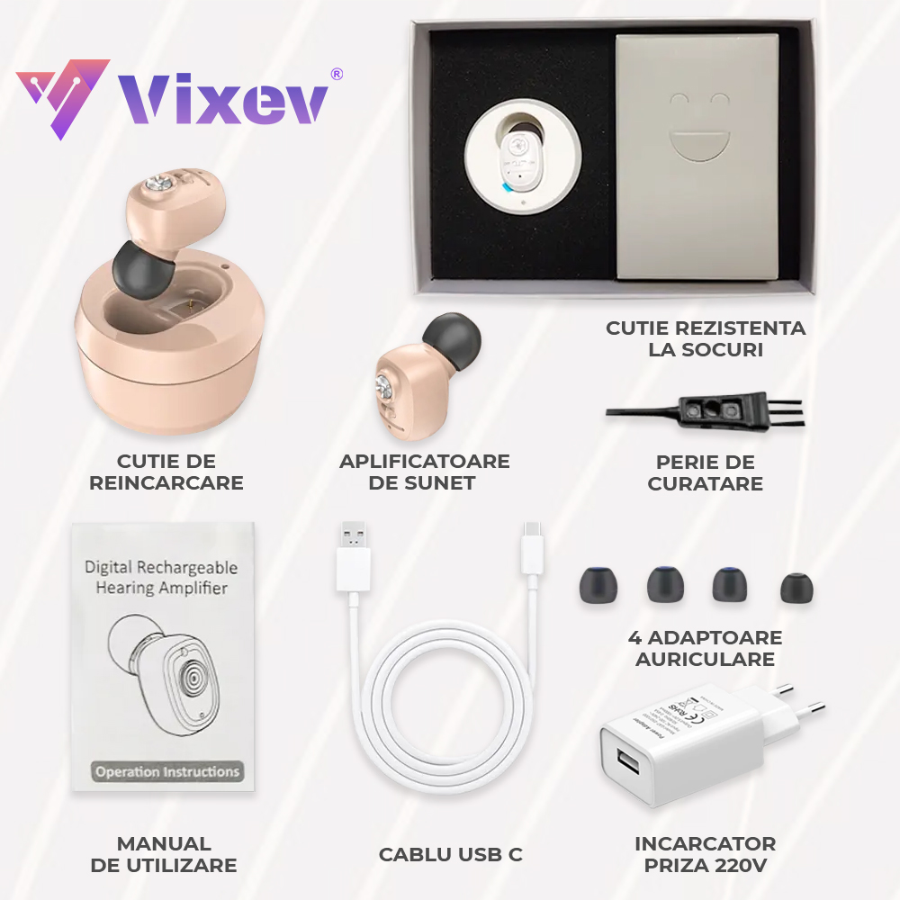 Ingrijire personala si CosmeticeSanatate si wellnessAparate medicaleAparate auditiveAparat Auditiv cu acumulator, reincarcabil, Vixev, Volum reglabil 130 dB, Hipoacuzie Medie-Severa, 4 adaptoare urechi