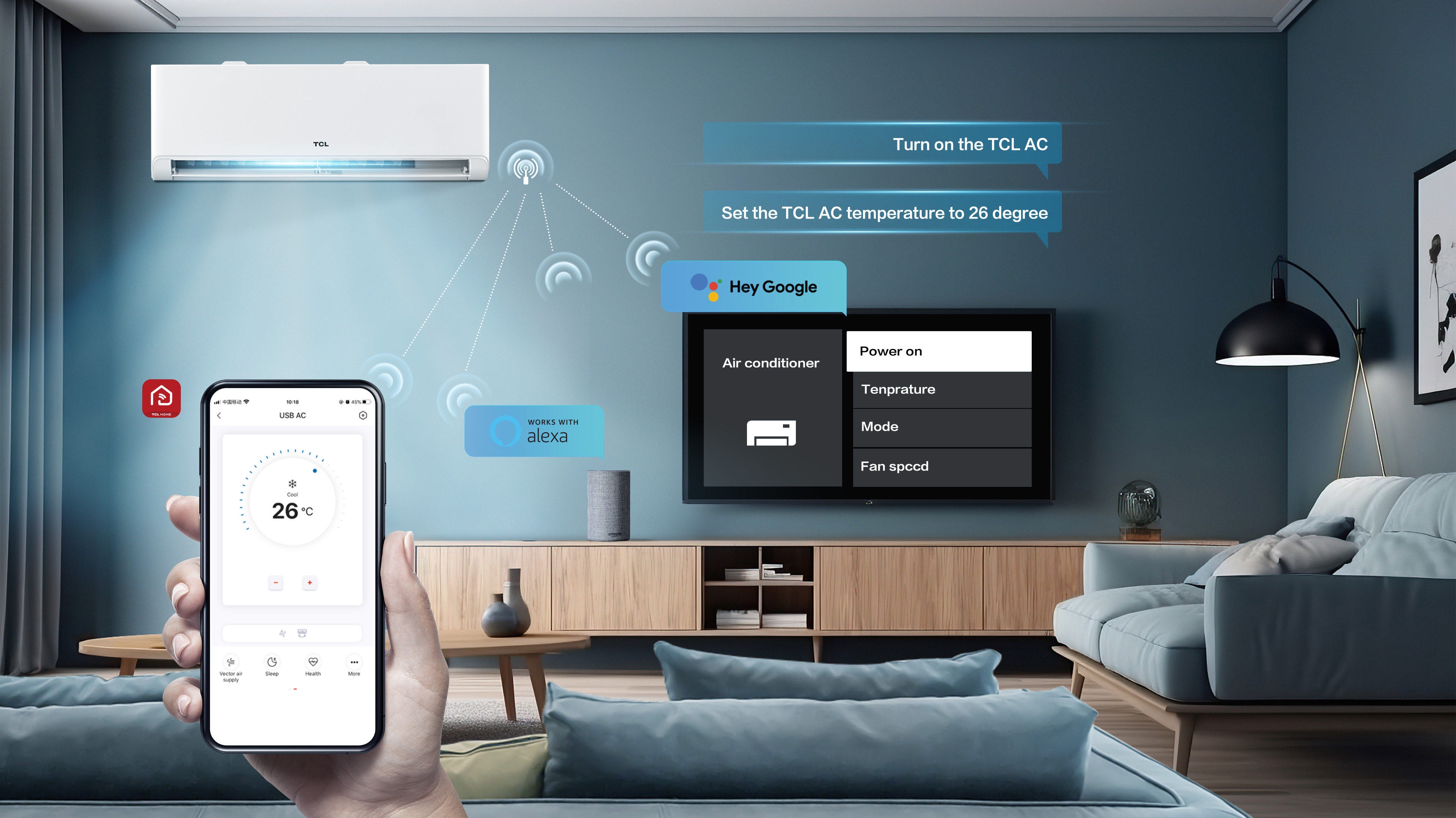 Compatibil cu Google Home. Actualizati-va casa la un ecosistem cu adevarat inteligent cu ajutorul noii noastre unitati de aer conditionat BreezeIN. Conectati-l la televizorul inteligent sau smartphone-ul prin intermediul aplicatiei TCL HOME sau a Google Assistant pentru control vocal si control la distanta convenabil. Preluati controlul confortului dvs. cu o convenienta fara efort si control complet la varful degetelor.