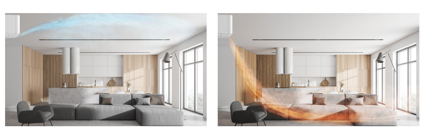 Fluxul de aer directionat in sus coboara de la tavan pentru a crea o racire imersiva.