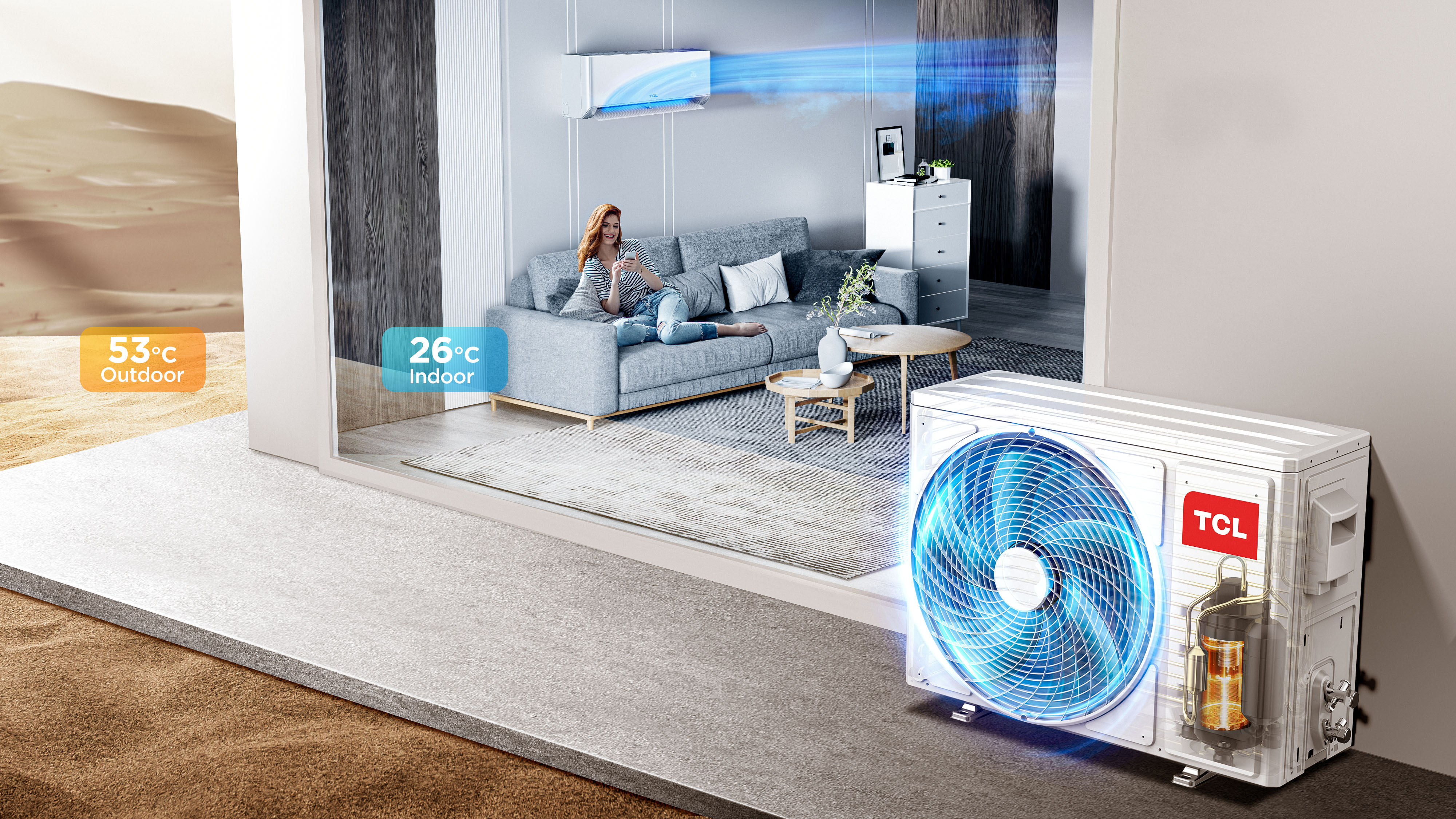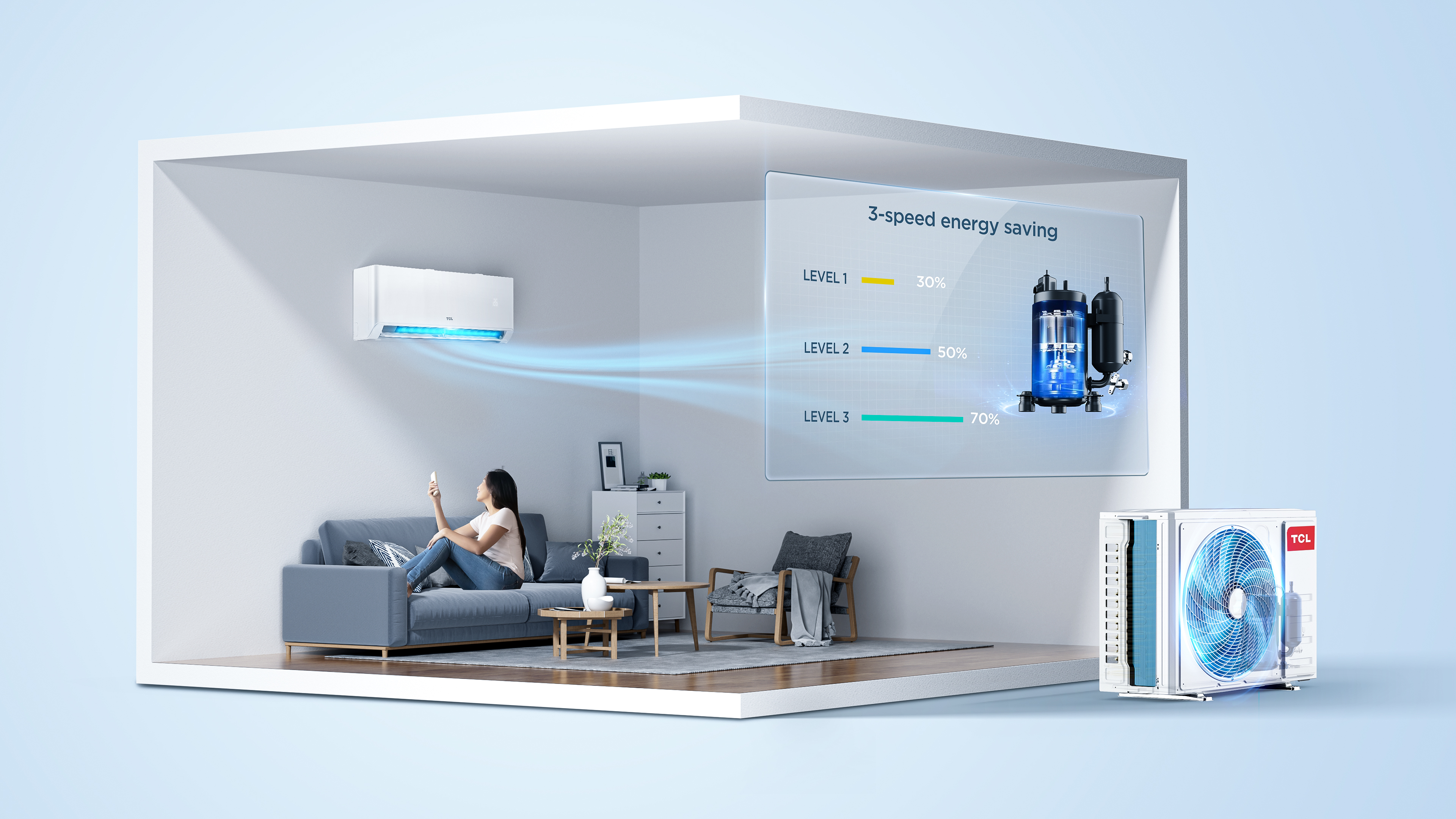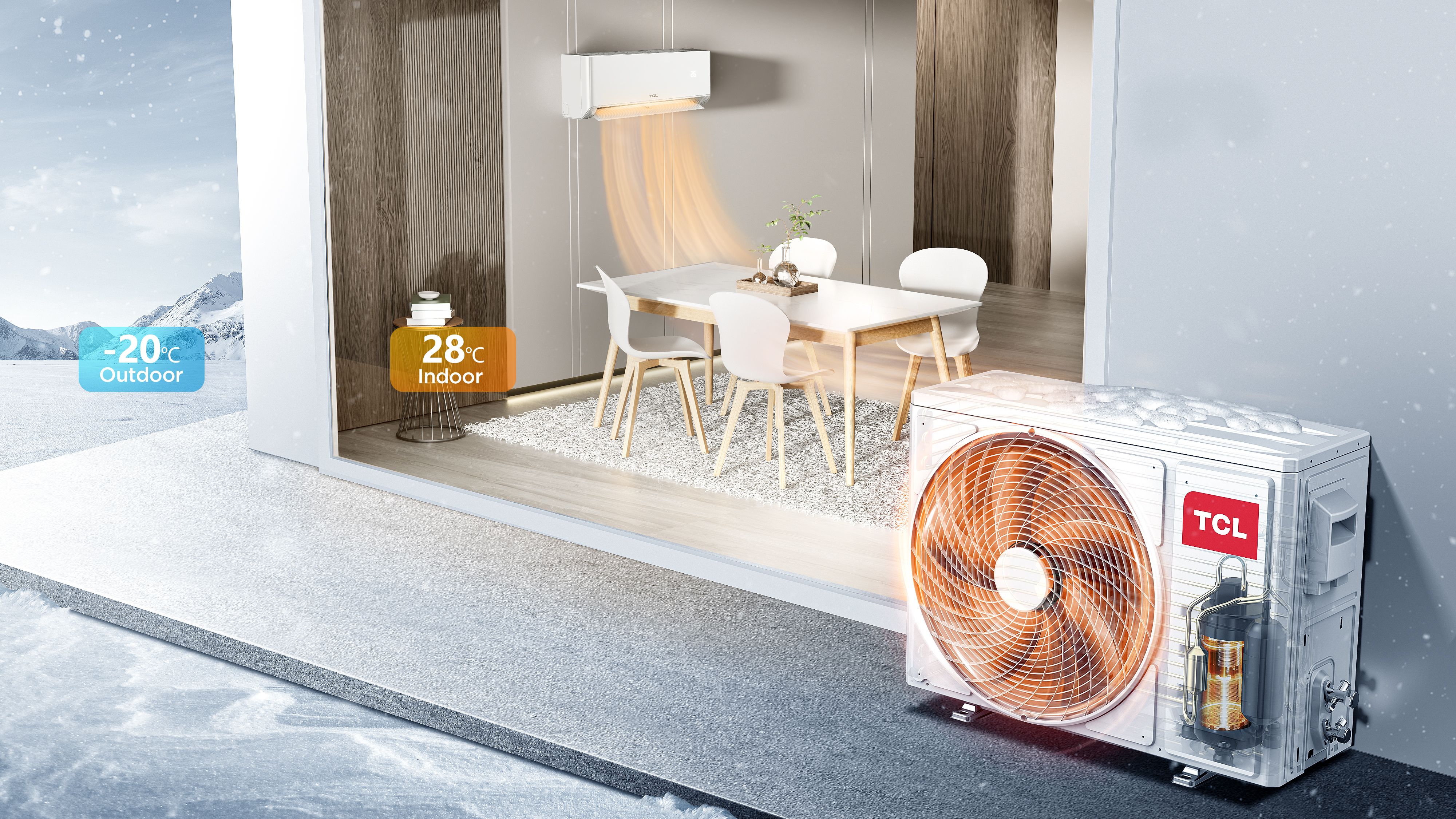 Compresorul TCL este proiectat sa functioneze eficient in vreme rece. Mentine functionalitatea de incalzire chiar si atunci cand temperatura exterioara scade pana la -20°C.