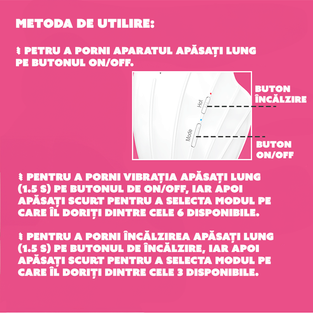 Versatilitate in functionare: Aparatul dispune de 3 moduri de incalzire si 6 niveluri de vibratii, oferind utilizatoarelor posibilitatea de a ajusta setarile in functie de preferintele personale si de nevoile specifice.