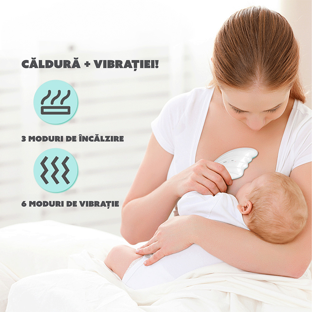 Ameliorarea canalelor mamare infundate: Cu ajutorul celor 3 moduri de incalzire si a celor 6 niveluri de vibratii, aparatul amelioreaza angorjarea canalelor mamare, imbunatatind eficient fluxul de lapte si goleste sanii in mod eficace.