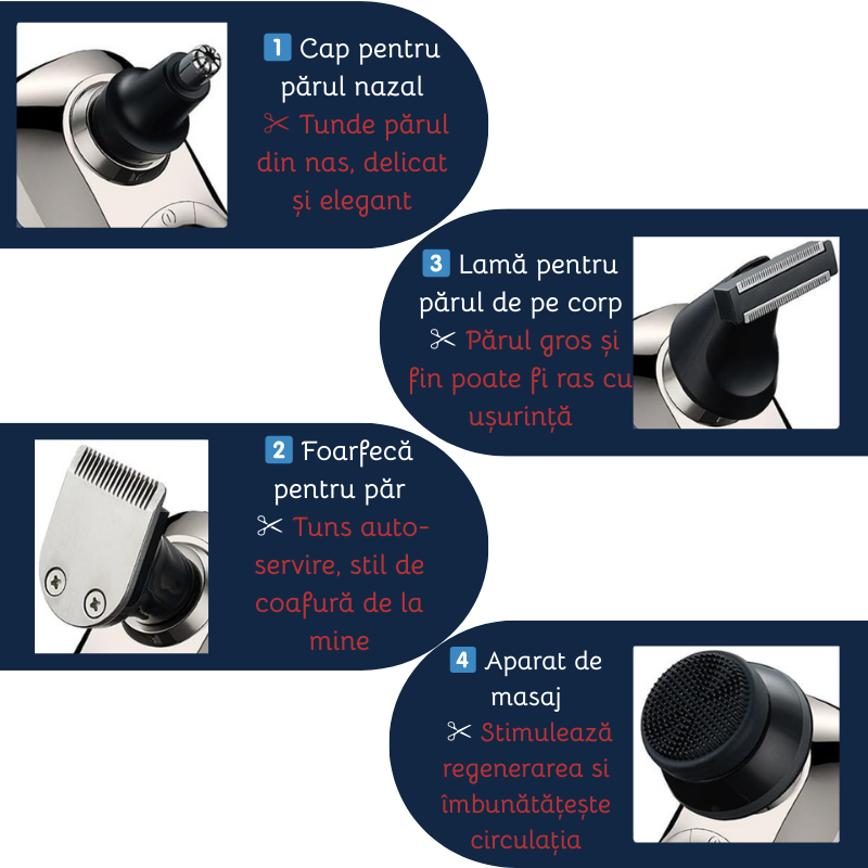 ✔ Multifunctional 5 in 1 – Include accesorii pentru tunderea perciunilor, ingrijirea nasului, curatarea fetei si un perie pentru masaj facial.