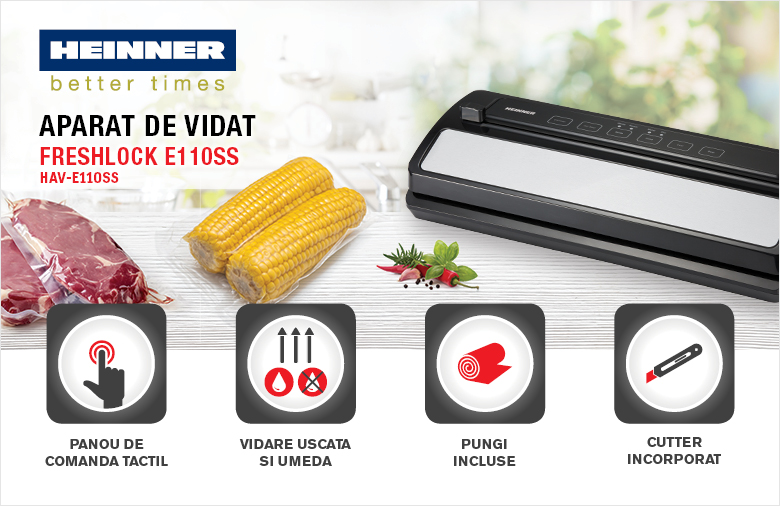 Prea multe alimente de consumat si prea putin timp? Sigur ti s-a intamplat! Daca nu vrei sa arunci mancarea, ci dimpotriva, sa te bucuri de ea un timp mai indelungat, iti facem cunostinta cu aparatul de vidat HEINNER HAV-E110SS. Acesta te ajuta sa pastrezi alimentele proaspete o perioada mai lunga de timp, dar tine si buzunarul pe plus. Fructe, legume, carne, peste sau chiar muraturi, videaza orice iti trece prin cap.