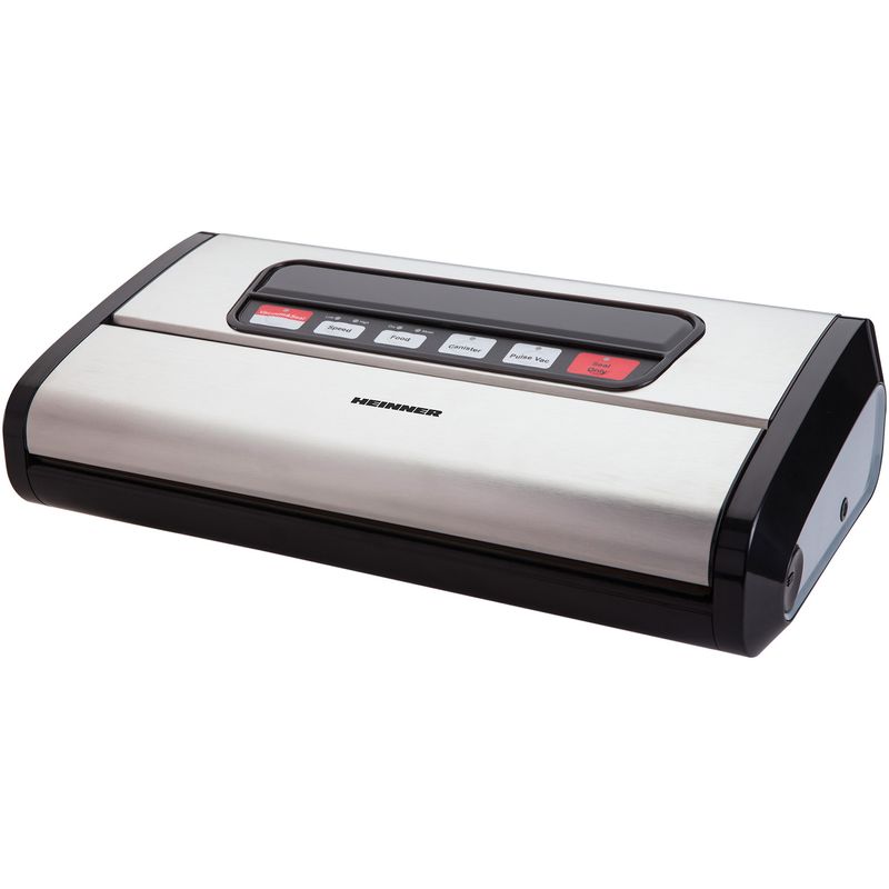 Aparat de vidat si sigilat Heinner HAV-165BKSS, vidare uscata/ umeda, pompa si sigilare dubla, sistem racire banda sigilare, furtun pentru caserole, cutter incorporat, compatibil cu pungi latime 32 cm, capacitate vidare 16 l/ min, 0.85 bar, 165W, inox