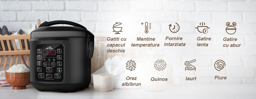 9 programe automate (orez alb, orez brun, gatire cu capac deschis, quinoa, mentinere cald, gatire la abur, gatire lenta, mancare amestec, iaurt)