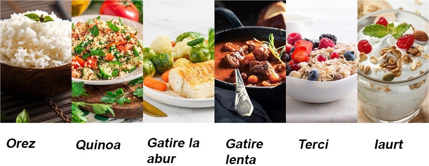 Gatire lenta – program sanatos, ideal pentru carne, legume si sosuri, cu durata 2–10 ore si niveluri de putere scazut / mediu / ridicat.