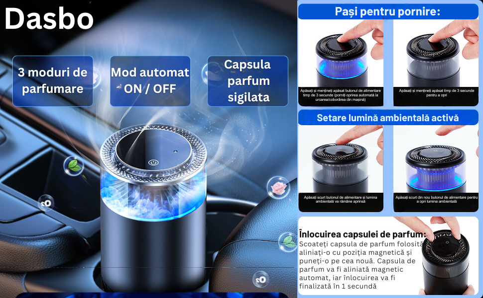 Functionare Silentioasa si Eficienta: Motorul puternic, dar silentios, asigura dispersarea rapida si eficienta a parfumului, fara zgomote deranjante. Acest difuzor functioneaza linistit in fundal, permitandu-va sa va bucurati de calatorii fara distrageri.