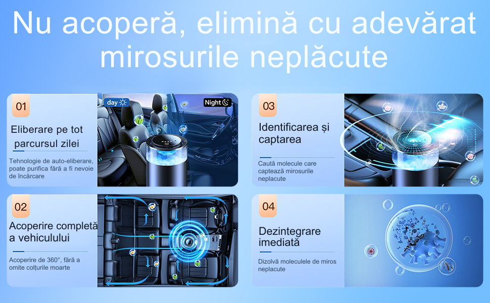 Eliminarea Eficienta a Mirosurilor Neplacute: Nu doar ca mascheaza mirosurile neplacute, dar acest difuzor le elimina complet. Sistemul sau avansat de captare si descompunere a aldehidelor si altor compusi neplacuti asigura un aer purificat si proaspat in interiorul masinii.