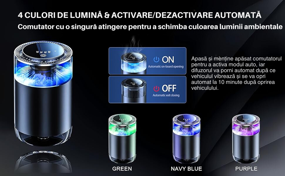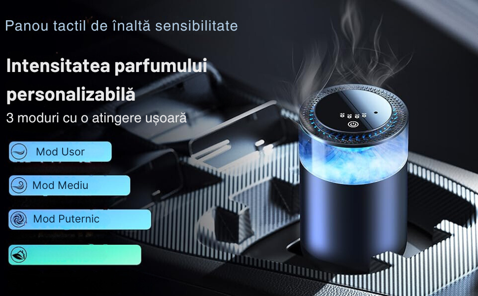 Design cu Panou Tactil de Inalta Sensibilitate: Difuzorul este echipat cu un panou tactil modern si usor de utilizat, care va permite sa ajustati setarile printr-o simpla atingere. Acest design intuitiv nu doar ca ofera confort, dar adauga si un element de lux interiorului masinii.