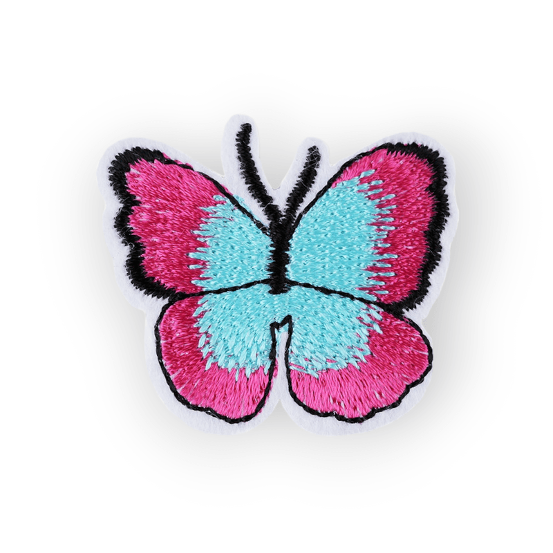 Aplicatie termoadeziva brodata, 36 x 40 mm Fluture fucsia si bleu Aplicatie termoadeziva brodata, 36 x 40 mm Fluture fucsia si bleu