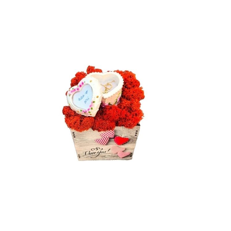 Aranjamentul este realizat intr-o cutiuta de lemn, frumos gravata cu inimioare si textul ”I love you!”, cu licheni stabilizati de culoare sienna, in mijloc avand o cutiuta din rasina in forma de inimioara, in capacul careia se poate insera o poza micuta, iar in interior se afla un lantic superb, cu un capat mai lung, din otel inoxidabil auriu, ce va rezista mult timp la fel de frumos.