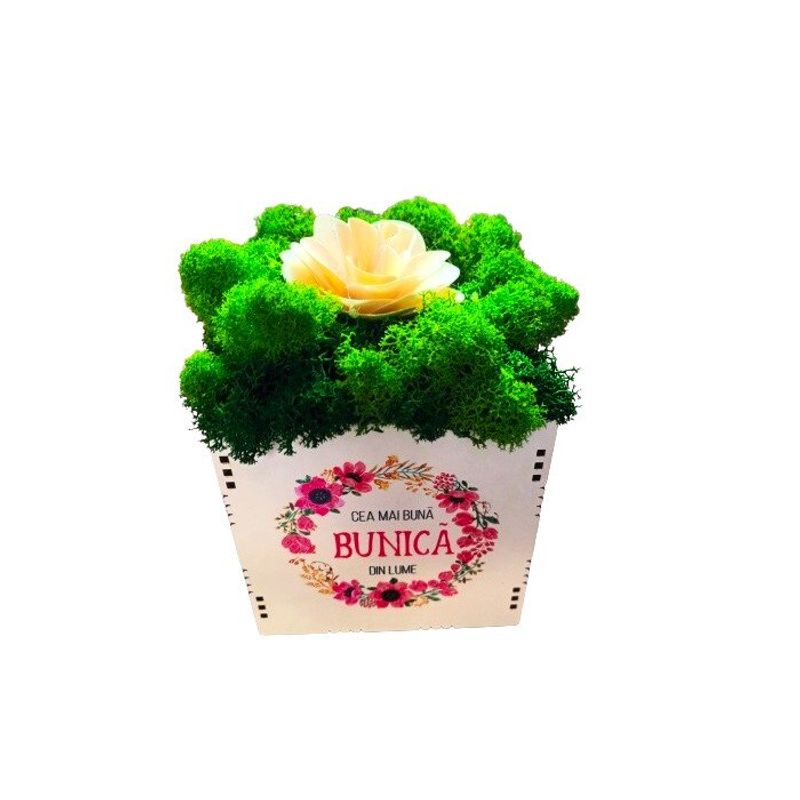Aranjamentul este creat din licheni naturali stabilizati si plante stabilizate si uscate (begonia natur) intr-o cutiuta de lemn decorata cu un minunat mesaj pentru bunica.