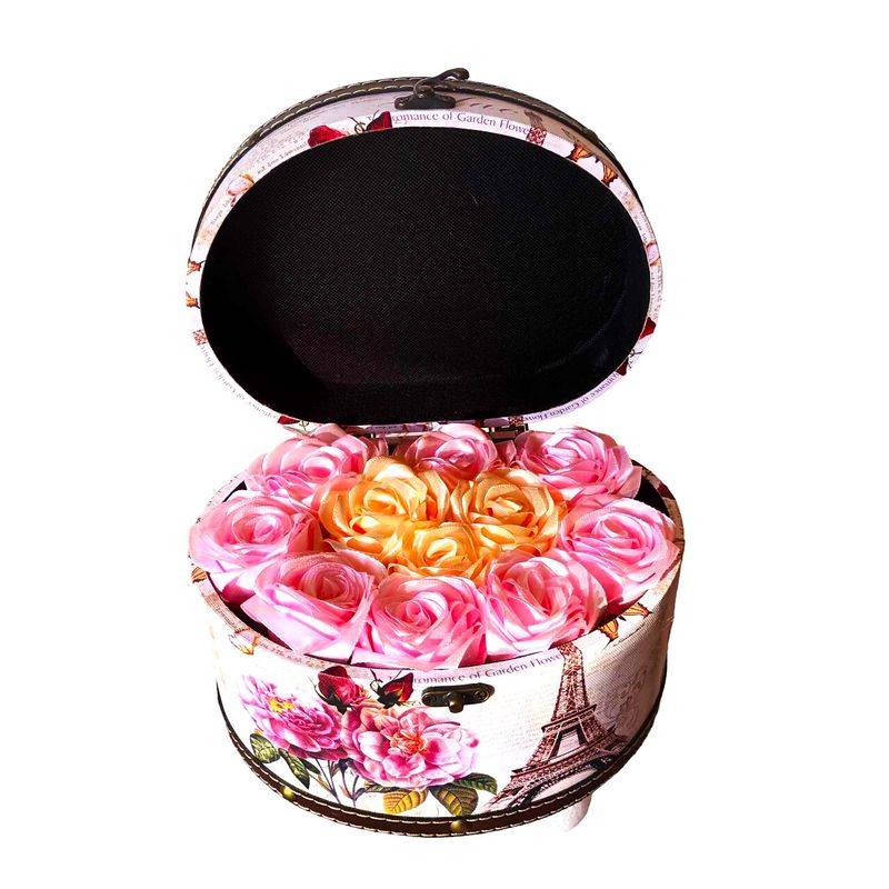 Aranjament flori satin, cufar cu 11 trandafiri, 24x18 cm, roz Aranjament flori satin, cufar cu 11 trandafiri, 24x18 cm, roz