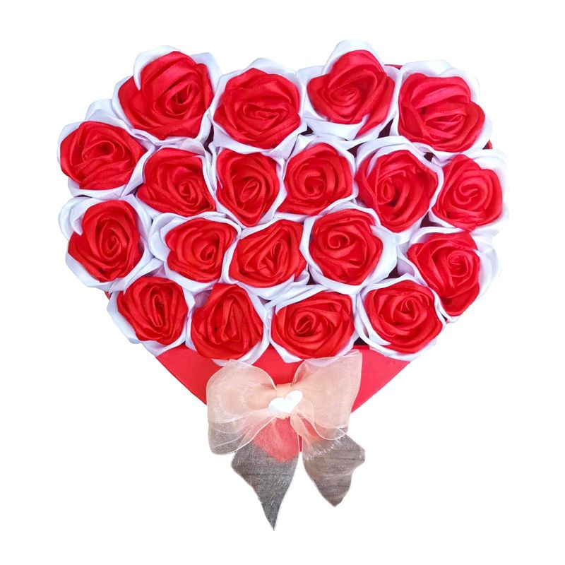 Aranjament flori satin, cutie inima cu suport, 19 trandafiri, 25 cm, rosu si alb Aranjament flori satin, cutie inima cu suport, 19 trandafiri, 25 cm, rosu si alb