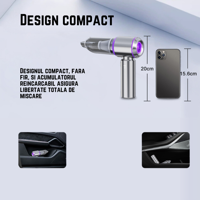 Reincarcabil: Acumulatorul incorporat ofera pana la 30 de minute de utilizare continua, ideal pentru curatenie in masina sau acasa.