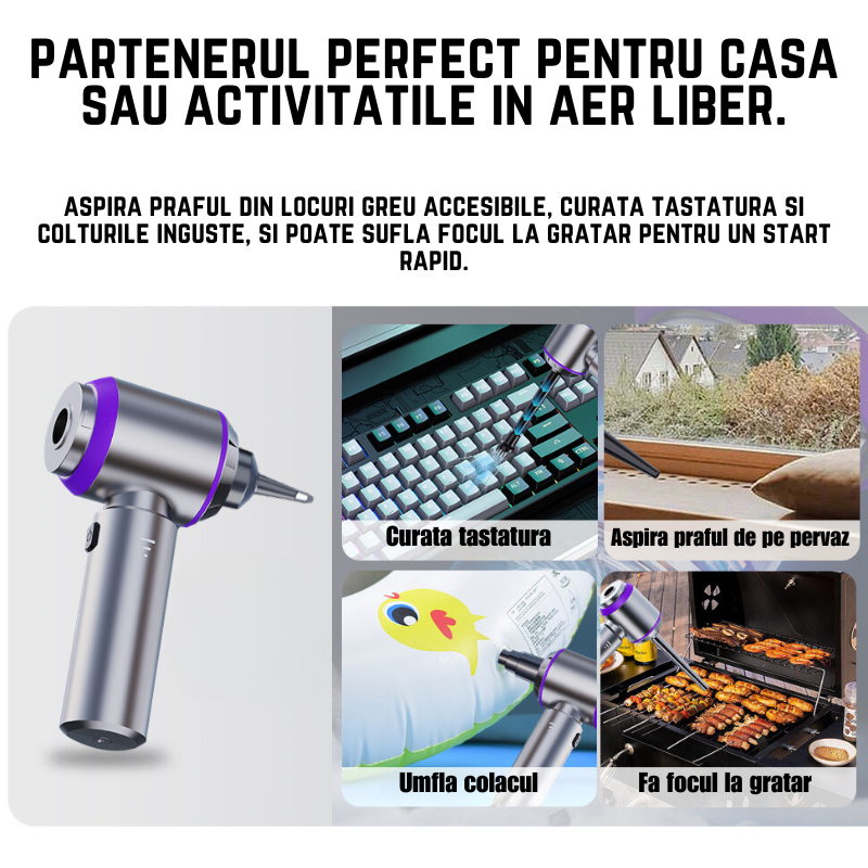 Aspiratorul multifunctional este solutia ideala pentru toate nevoile tale de curatenie si intretinere. Cu functii versatile, acest aparat nu doar ca aspira praful din locuri greu accesibile, curata tastatura si colturile inguste, dar poate si sufla focul la gratar pentru un start rapid si perfect. In plus, este echipat pentru a umfla cu usurinta colacul de plaja, mingea sau alte obiecte gonflabile, economisind timp si efort. Compact si usor de utilizat, acest aspirator devine partenerul perfect atat pentru casa, cat si pentru activitatile in aer liber.