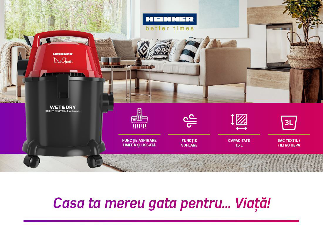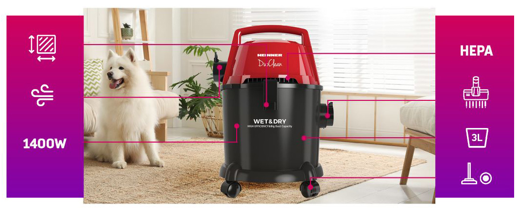 Aspirator multifunctional HEINNER DuoClean HVC-MWD1400P-BK, putere 1400W, functie aspirare umeda si uscata, functie suflare, recipient din plastic, capacitate 15l, sac textil 3l, filtru HEPA, tuburi de plastic, accesorii: perie mare pentru aspirare uscata, perie pentru aspirare umeda, perie pentru spatii inguste.