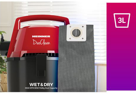 Aspiratorul DuoClean® vine insotit de un sac colector al prafului de 3 litri. Pe langa capacitatea mare de colectare, acesta este creat dintr-un material rezistent ce nu permite prafului strans sa se raspandeasca in interiorul recipientului, fiind creat un strat filtrant pentru o curätenie optimä.