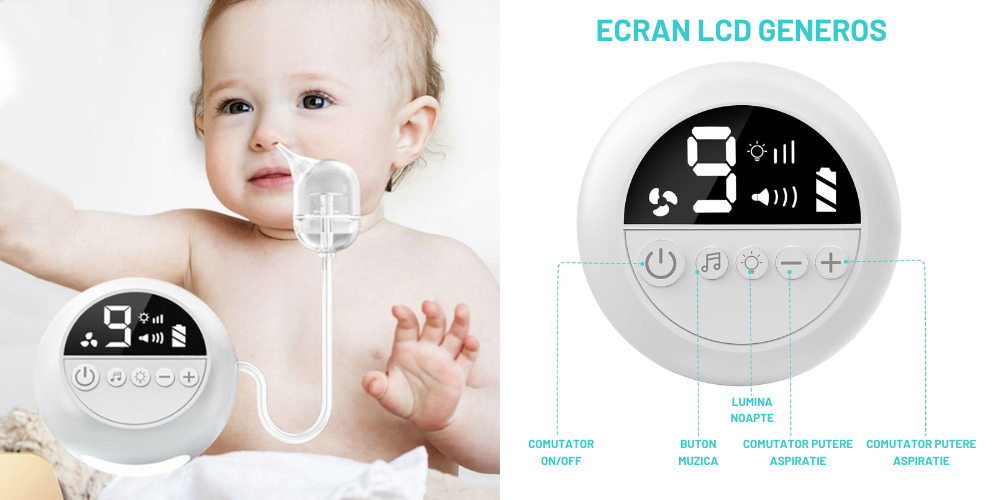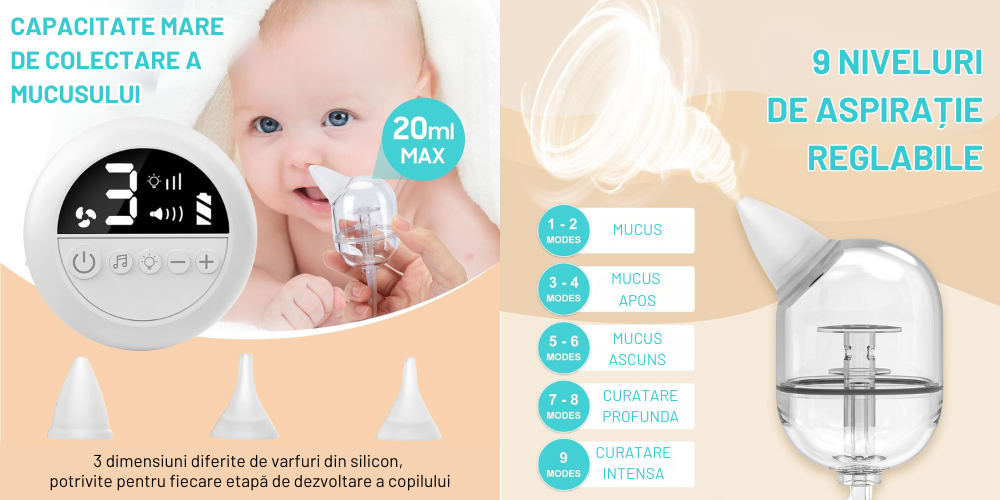 9 niveluri de aspiratie reglabile Curata fara efort mucusul nazal si mucurile