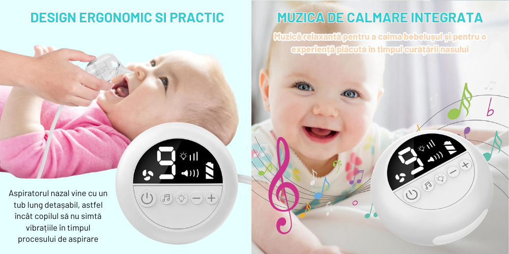 Aspiratorul nazal vine cu muzica linistitoare care ajuta la stabilizarea dispozitiei bebelusului pentru o curatare nazala rapida si fara griji, ajutand la minimizarea fricii sau rezistentei copilului la proces.