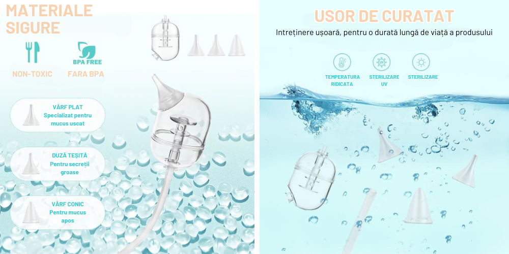 Indepartarea eficienta si blanda a secretiei nasului persistent datorita puterii de aspiratie la nivelul dispozitivelor medicale, varfurilor din silicon moale care asigura siguranta.