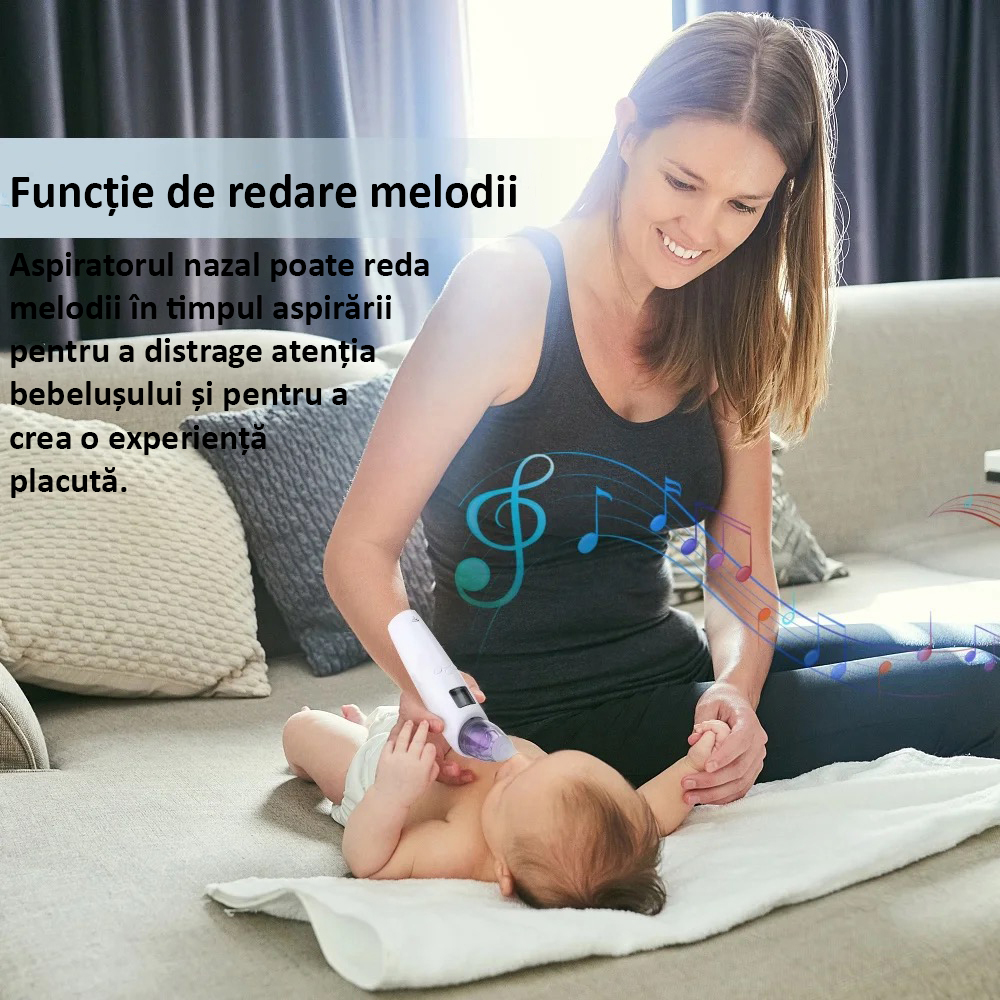 O alta caracteristica interesanta a acestui aspirator nazal electric este functia de muzica si lumina. Sunetele blande si lumina calda pot ajuta la distragerea atentiei copilului in timpul aspirarii, transformand procesul intr-o experienta mai placuta si mai putin stresanta pentru el.