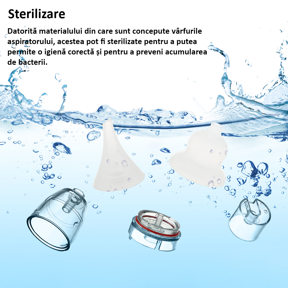 Aspiratorul nazal electric vine cu doua capete de silicon, care pot fi schimbate si curatate cu usurinta. Aceasta permite o igiena adecvata si previne acumularea de bacterii sau impuritati.
