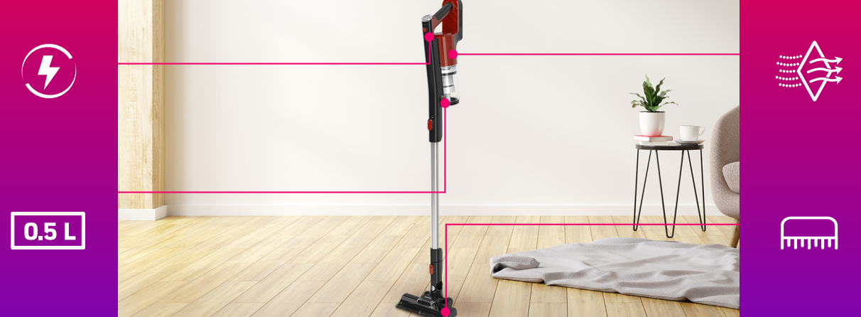 Aspirator vertical Heinner Red Twilight HSVC-M21.6RD, 150 w, acumulator li 21.6v, filtrare ciclonica, dubla utilizare: de mana sau vertical, 2 viteze, capacitate: 0.5l, autonomie max 30 min, accesoriu montare perete, rosu