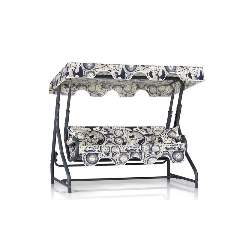 Scaunul balansoar triplu de grădină are o combinație uimitoare de culori negru și crem, creând un aspect atemporal și elegant care completează orice grădină sau spațiu în aer liber. Conceptul complicat de damasc, hartă și grădină adaugă o notă de rafinament, făcând din acest scaun balansoar o adevărată piesă de referință.