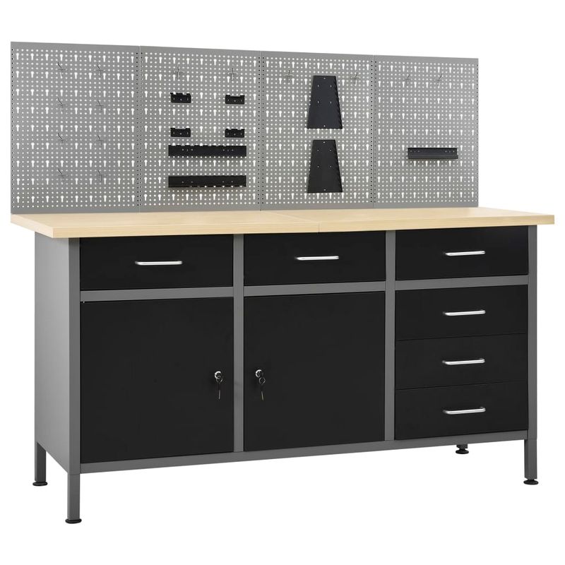 Bancul de lucru rezistent se remarca printr-un spatiu amplu de depozitare si o capacitate de incarcare de 500 kg. Acest blat mare si robust ofera o platforma stabila pentru toate lucrarile dvs. de reparatii. Bancul de lucru are 6 sertare, pentru a va organiza corect uneltele, piesele si accesoriile precum suruburi, cuie sau banda adeziva. Toate sertarele sunt echipate cu mecanism cu rulment cu bile pentru alunecare lina. Exista 2 rafturi si un compartiment mare cu 2 usi care se pot incuia, unde pot fi depozitate cu usurinta masini de gaurit, tamburi pentru cabluri si polizoare. In plus, picioarele sunt reglabile pe inaltime. Aceasta statie de lucru este realizata din otel premium si lemn prelucrat, fiind foarte robusta, durabila si usor de curatat. Este usor de asamblat.