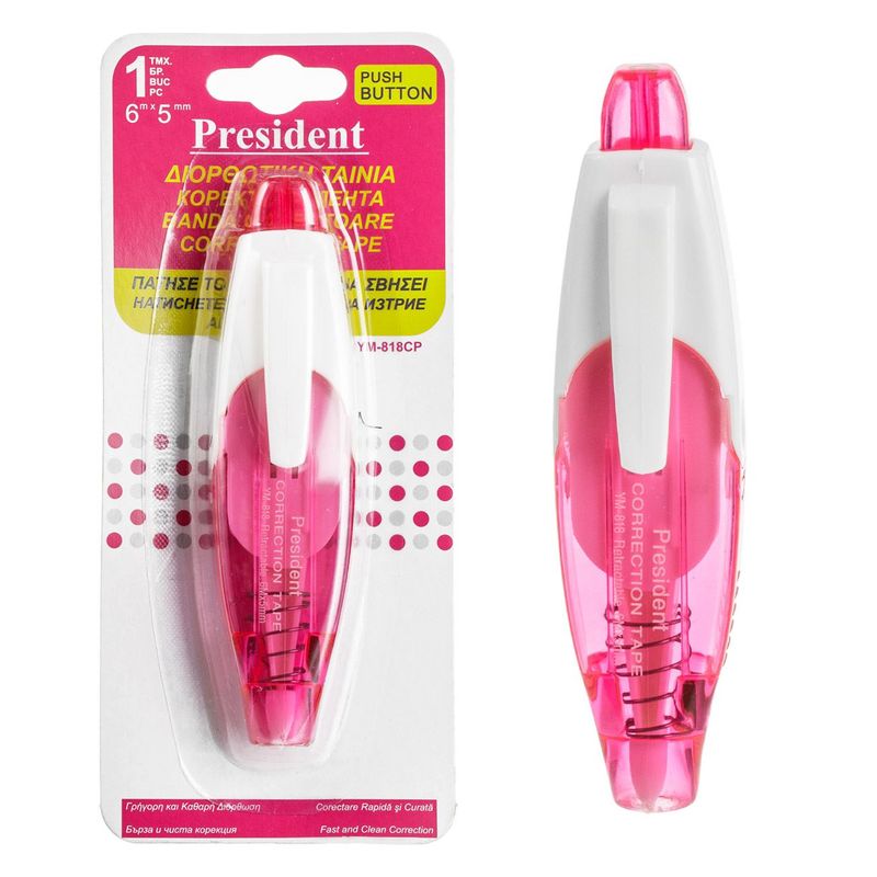 Banda corectoare president, pix cu buton, roz, 6m x 5mm Banda corectoare president, pix cu buton, roz, 6m x 5mm