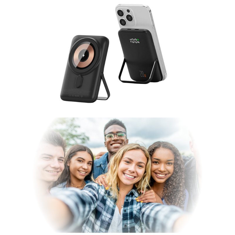 Include o bara metalica retractabila care se transforma intr-un suport de telefon stabil – perfect pentru apeluri video, filme sau conferinte online. Compacta, slim si eleganta, bateria poate fi folosita pe birou, in avion sau in deplasare fara sa ocupe spatiu inutil.