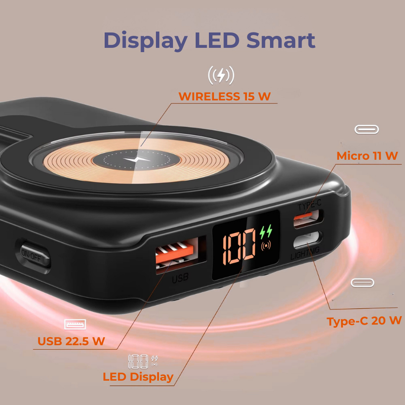 Sistemul magnetic MagSafe o face perfect compatibila cu iPhone 12, 13, 14, 15 si modelele ulterioare, iar prin porturile multiple poate alimenta orice dispozitiv Android, tableta, casti wireless sau gadget smart.