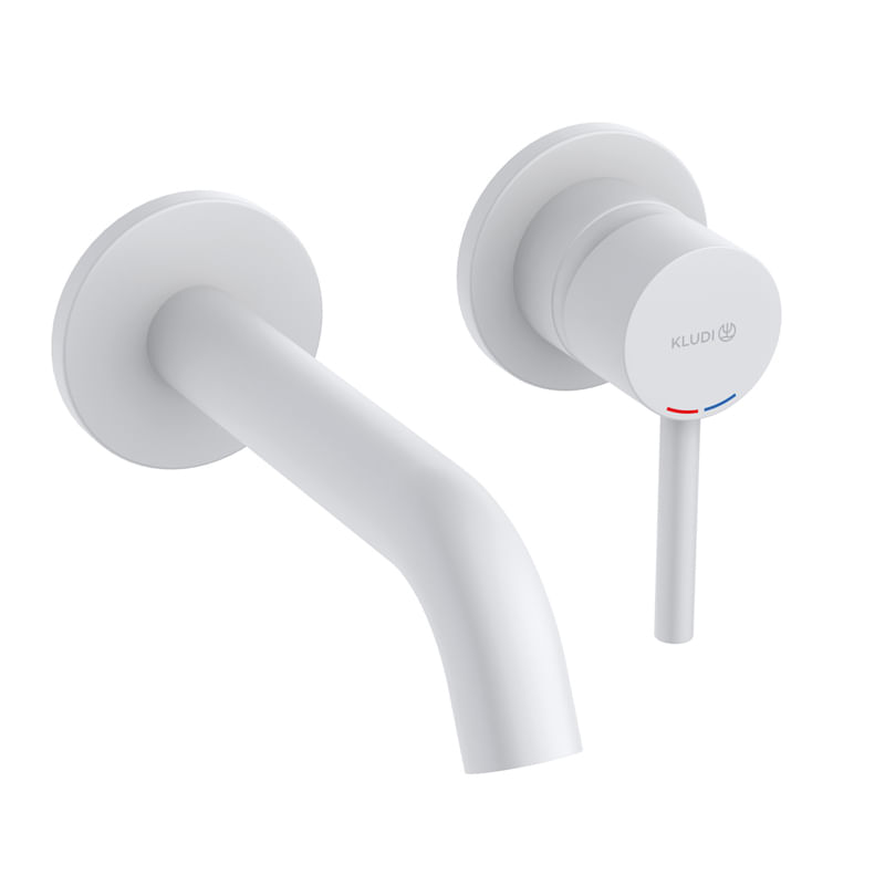 Baterie pentru lavoar, Kludi, Bozz, cu montaj pe perete, pipa 18 cm, alb mat Baterie pentru lavoar, Kludi, Bozz, cu montaj pe perete, pipa 18 cm, alb mat