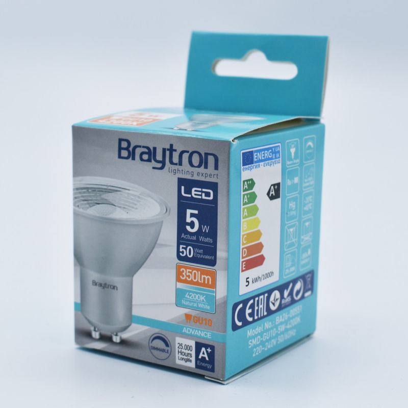 Becul LED GU10 Braytron este proiectat pentru a fi eficient din punct de vedere energetic, permitandu-va sa economisiti energie si sa reduceti costurile facturilor de electricitate. Cu o putere de doar 5.5W, acest bec ofera aceeasi nivel de iluminare ca un bec traditional de 50W, oferindu-va un iluminat eficient si economic.