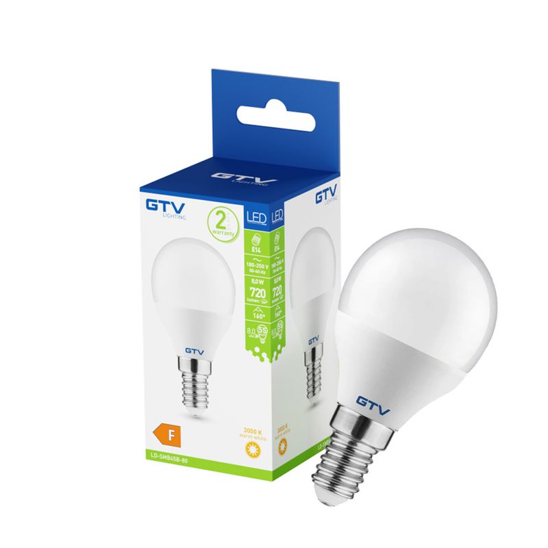 Bec led 8W (55W) GTV, Sferic, E14, 720 lm, lumina calda (3000K), clasa energetica F Bec led 8W (55W) GTV, Sferic, E14, 720 lm, lumina calda (3000K), clasa energetica F