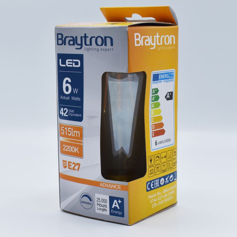 Date tehnice Bec led Vintage Filament Avocado 6W (42W), E27, ST64,515lm, dimabil, lumina calda (2200K), auriu, Braytron