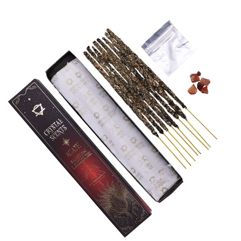 Casa si GradinaDecoratiuniAromaterapie si lumanariOdorizante cameraBețișoare parfumate cu cristal de Agat Roșu și aromă de Șofran | Ritual de vitalitate, curaj și energie creatoare