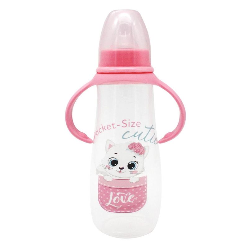 Biberon plastic honey baby, model pisica, maner roz, capacitate 300ml, tetina silicon, fete Biberon plastic honey baby, model pisica, maner roz, capacitate 300ml, tetina silicon, fete