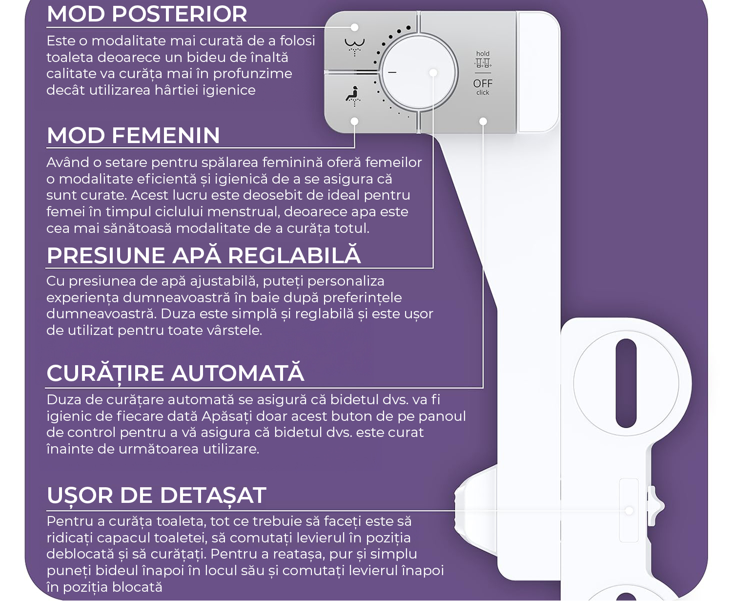 Bideu retractabil, design cu auto curatare, modern, control presiune, curatare eficienta si confortabila, duze duble, instalare usoara, rapida, usor de detasat, argintiu