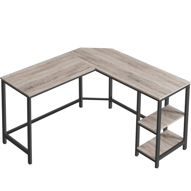 Marca: VASAGLE Dimensiuni produs: 138D x 138L x 75H cm Culoare: Greige + negru. Stil: industrial Material de baza: otel aliat Despre acest articol Birou mare: Cu un birou de 138 x 138 cm, acest birou in forma de L se potriveste pentru 3 pana la 4 monitoare de calculator si va ofera o suprafata ampla pentru a lucra sau a juca jocuri pe calculator, ajutandu-va sa aveti totul la indemana. Raft de depozitare detasabi: Raftul superior al celor 2 rafturi de depozitare deschise este detasabil. Il puteti indeparta pentru a va potrivi turnul de calculator sau il puteti pastra pentru a depozita carti, fisiere sau articole utilizate frecvent pentru acces usor. Colt taiat pentru a face ordine in cabluri: Coltul din spate al acestui birou de colt in forma de L este taiat pentru a permite trecerea cablurilor, ajutandu-va sa gestionati cablurile de la electronice pentru a va pastra biroul ordonat si placut ochiului. Robust si durabil: Un cadru robust din otel, combinat cu placi aglomerate de calitate, face ca acest birou de calculator sa fie robust si durabil, care suporta pana la 50 kg, oferind un suport durabil pentru munca, studiul si recreerea dvs. Picioare reglabile practice: Picioarele reglabile mentin biroul de birou stabil pe podele inegale si va protejeaza podeaua de zgarieturi. Fluxul dvs. de spirit nu va mai fi intrerupt de clatinari enervante!